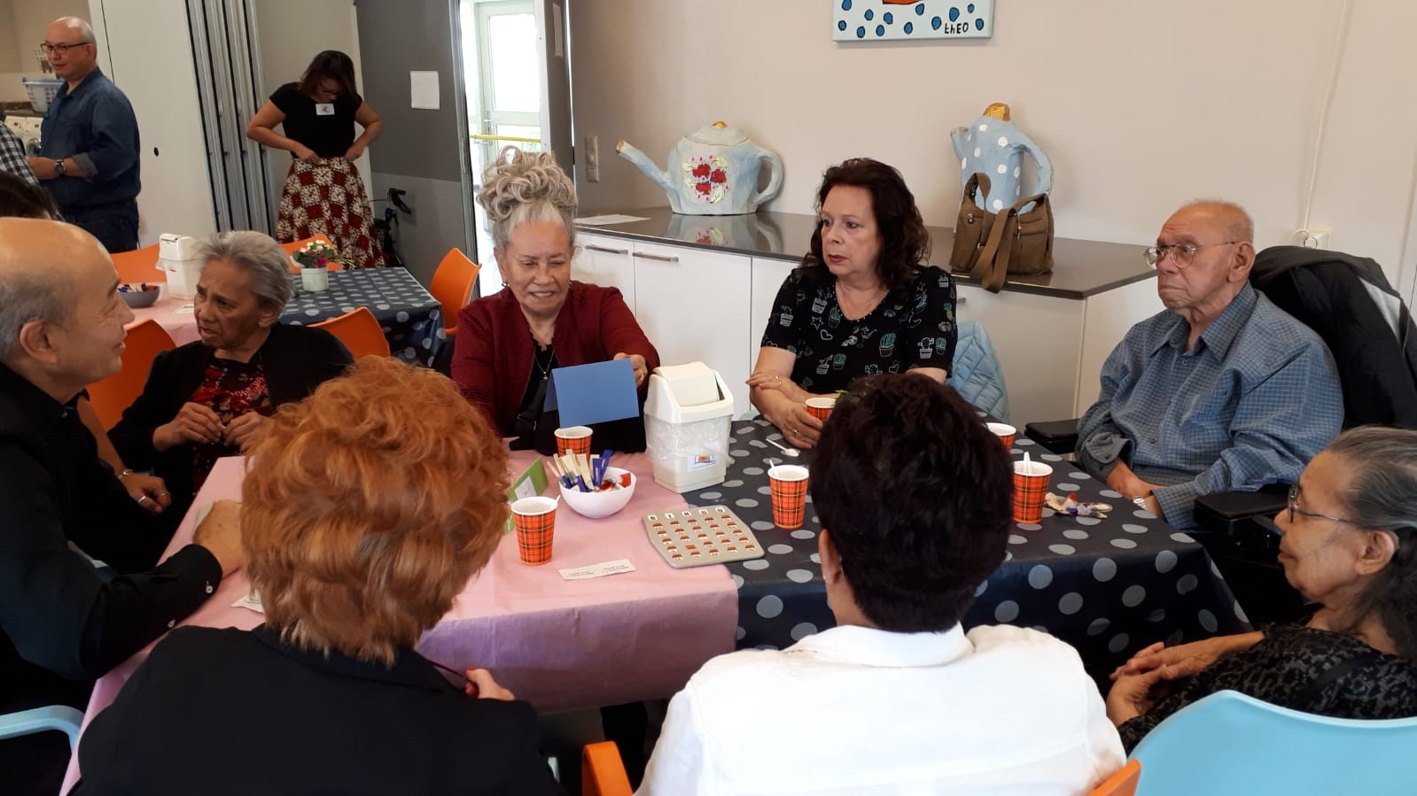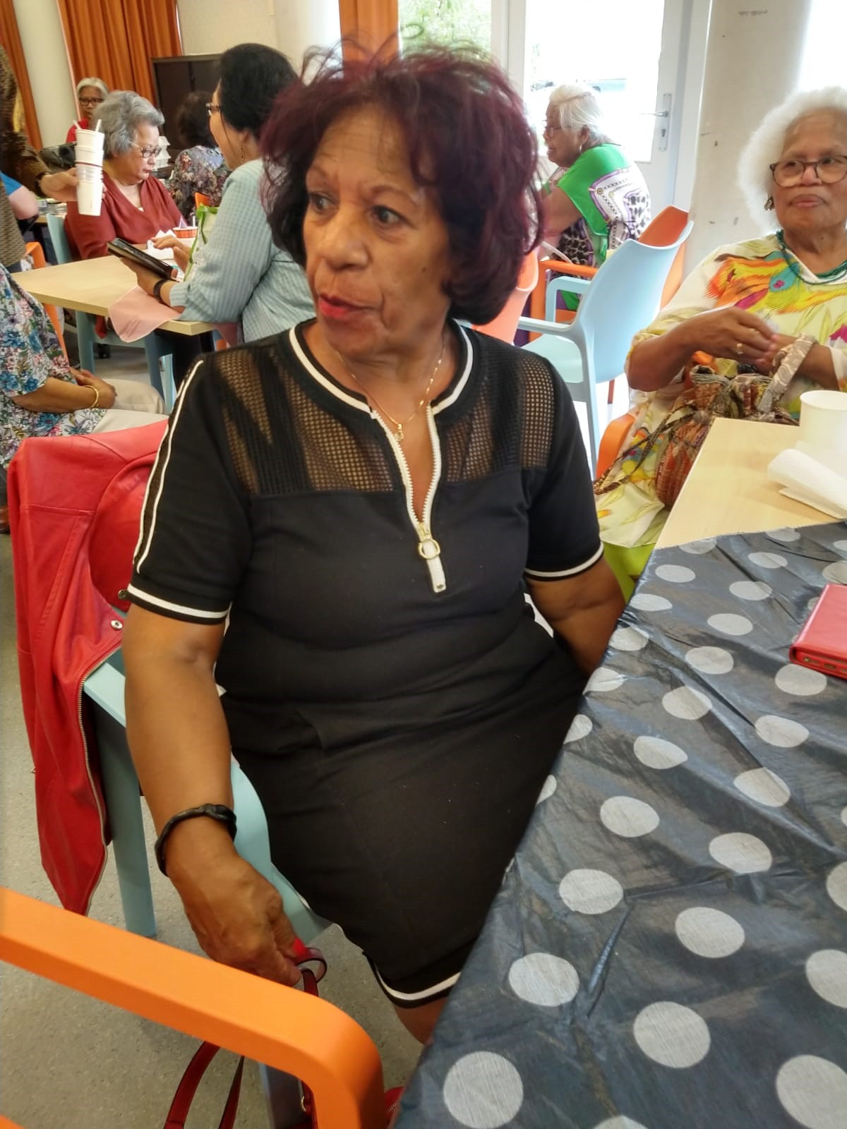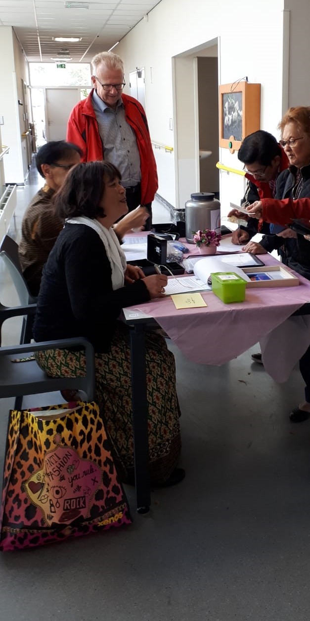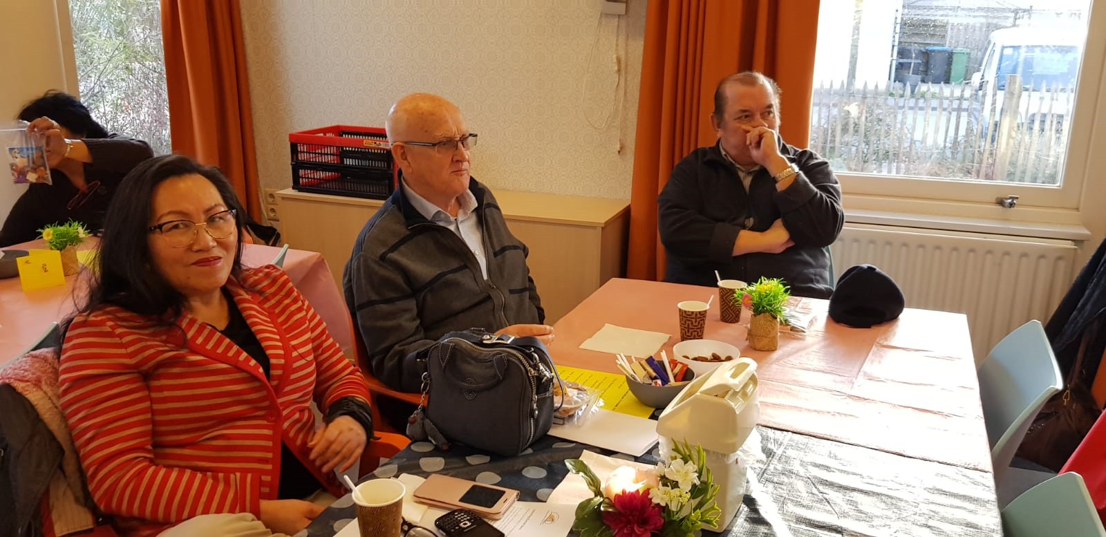 Afgesproken was dat wij om 15.30 uur bij AC Rijkerswoerd zouden verzamelen om vandaar met twee bussen richting Wageningen te vertrekken. Gelukkig kwam iedereen op tijd en konden we rond 15.30 uur naar Menzis rijden. Daar hadden wij om 16.30 uur afgesproken met de mensen die op eigen gelegenheid zouden komen. We waren ruim op tijd en moesten nog een tijdje wachten voordat wij naar binnen mochten. Tamara had er voor gezorgd dat wij aan 3 tafels konden gaan zitten, in totaal waren we met 24 genodigden inclusief chauffeurs. Tamara zorgde er meteen voor dat wij te drinken kregen, voor de één een sapje en voor de ander een wijntje.