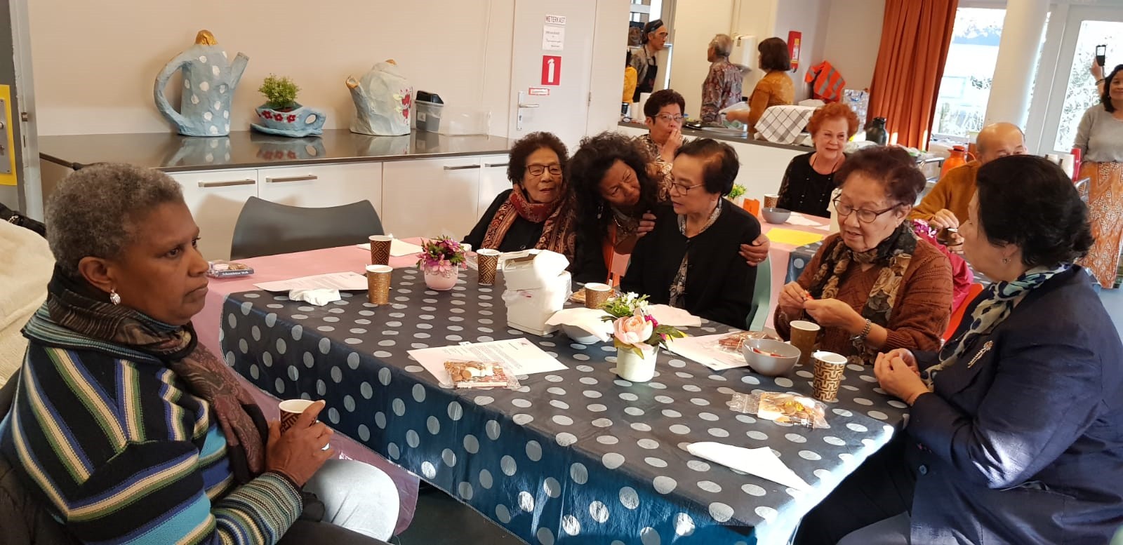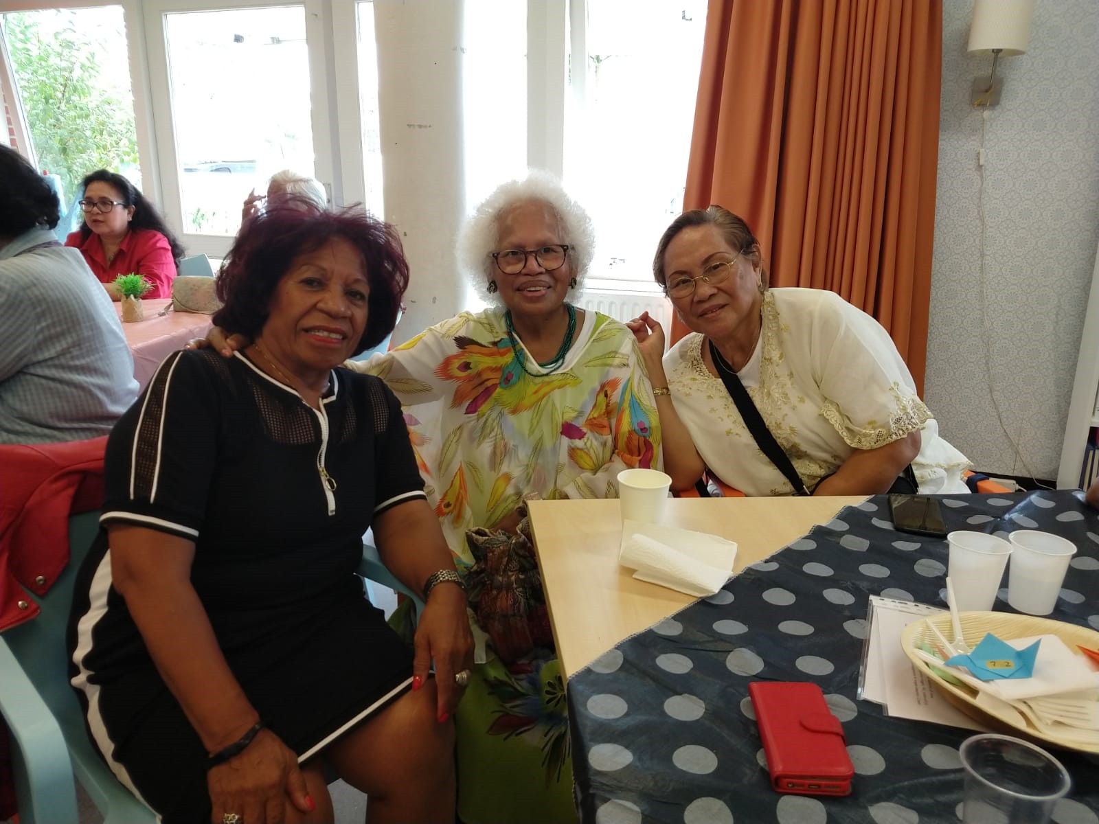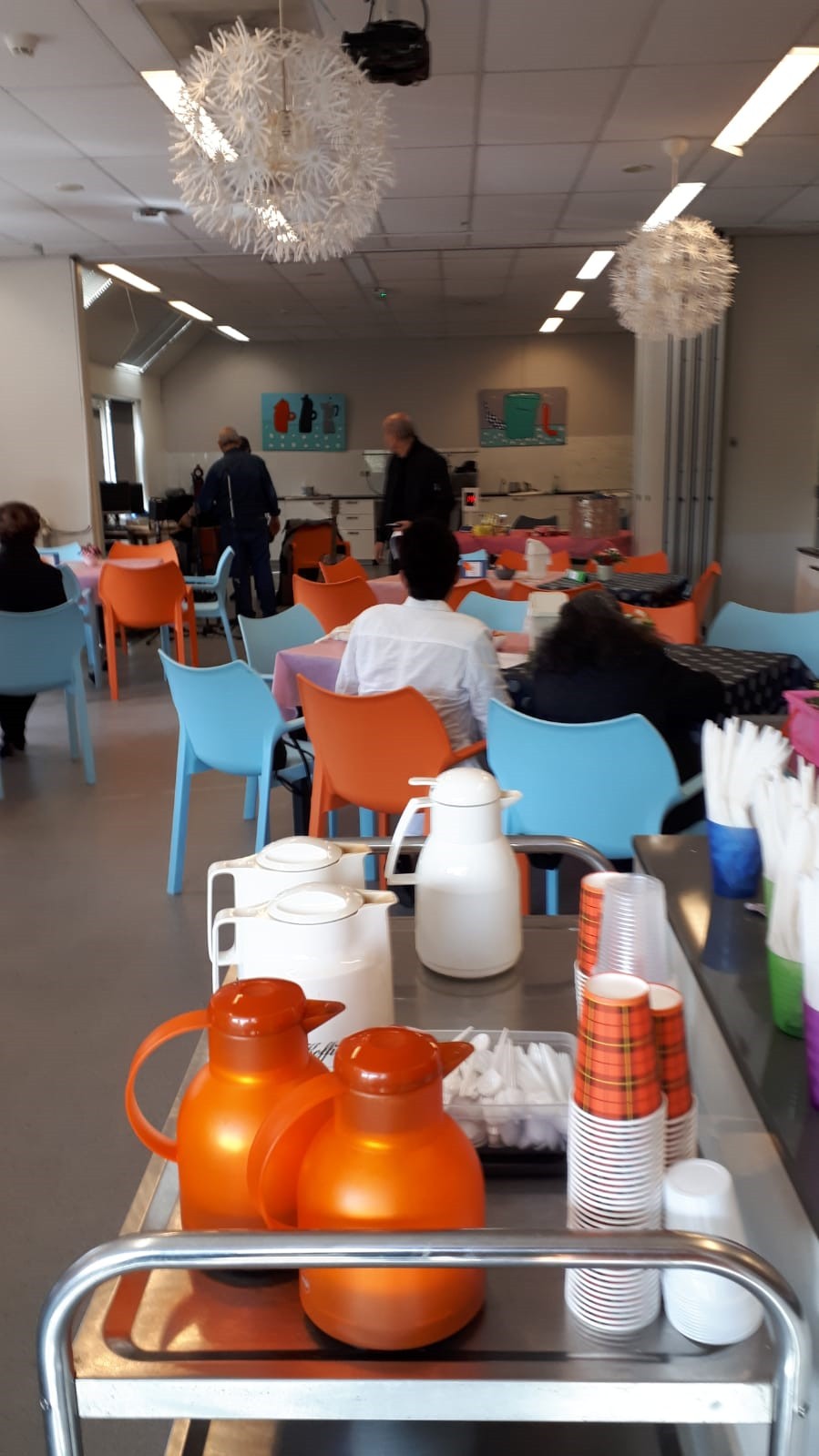 Afgesproken was dat wij om 15.30 uur bij AC Rijkerswoerd zouden verzamelen om vandaar met twee bussen richting Wageningen te vertrekken. Gelukkig kwam iedereen op tijd en konden we rond 15.30 uur naar Menzis rijden. Daar hadden wij om 16.30 uur afgesproken met de mensen die op eigen gelegenheid zouden komen. We waren ruim op tijd en moesten nog een tijdje wachten voordat wij naar binnen mochten. Tamara had er voor gezorgd dat wij aan 3 tafels konden gaan zitten, in totaal waren we met 24 genodigden inclusief chauffeurs. Tamara zorgde er meteen voor dat wij te drinken kregen, voor de één een sapje en voor de ander een wijntje.