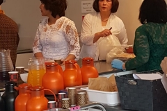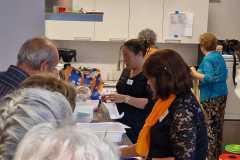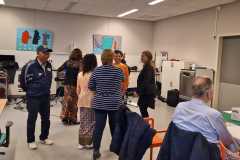 Na de koffie/thee begaven wij richting werkplaats, waar wij een demonstratie en uitleg op een leuke wijze kregen. Intussen werd alles klaar gezet voor de lunch. De lucht van gefrituurde kroketten kwam je tegemoet. De tafel was gedekt met kannen jus d’orange en melk, thee- en koffie, leuke bakjes gevuld met boter, jam, mosterd, melkkuipjes en suiker en een schaal met krentenbrood, sneetjes wit- en bruinbrood en lekkere belegde broodjes. De kroketten werden uitgedeeld. Het was goed verzorgd.