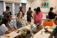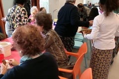 Teruggekomen bij de klompenmakerij kregen wij 2 drankjes en een warm hapje en had je de gelegenheid om mee te doen met de workshop klompje verven. De mensen waren zeer creatief. De klompjes waren verschillend gedecoreerd, b.v. blauwe, groene, rode en gele, al dan niet met bloempjes, stipjes of streepjes. Iedereen kreeg een klompje mee, geschilderd of blanco.