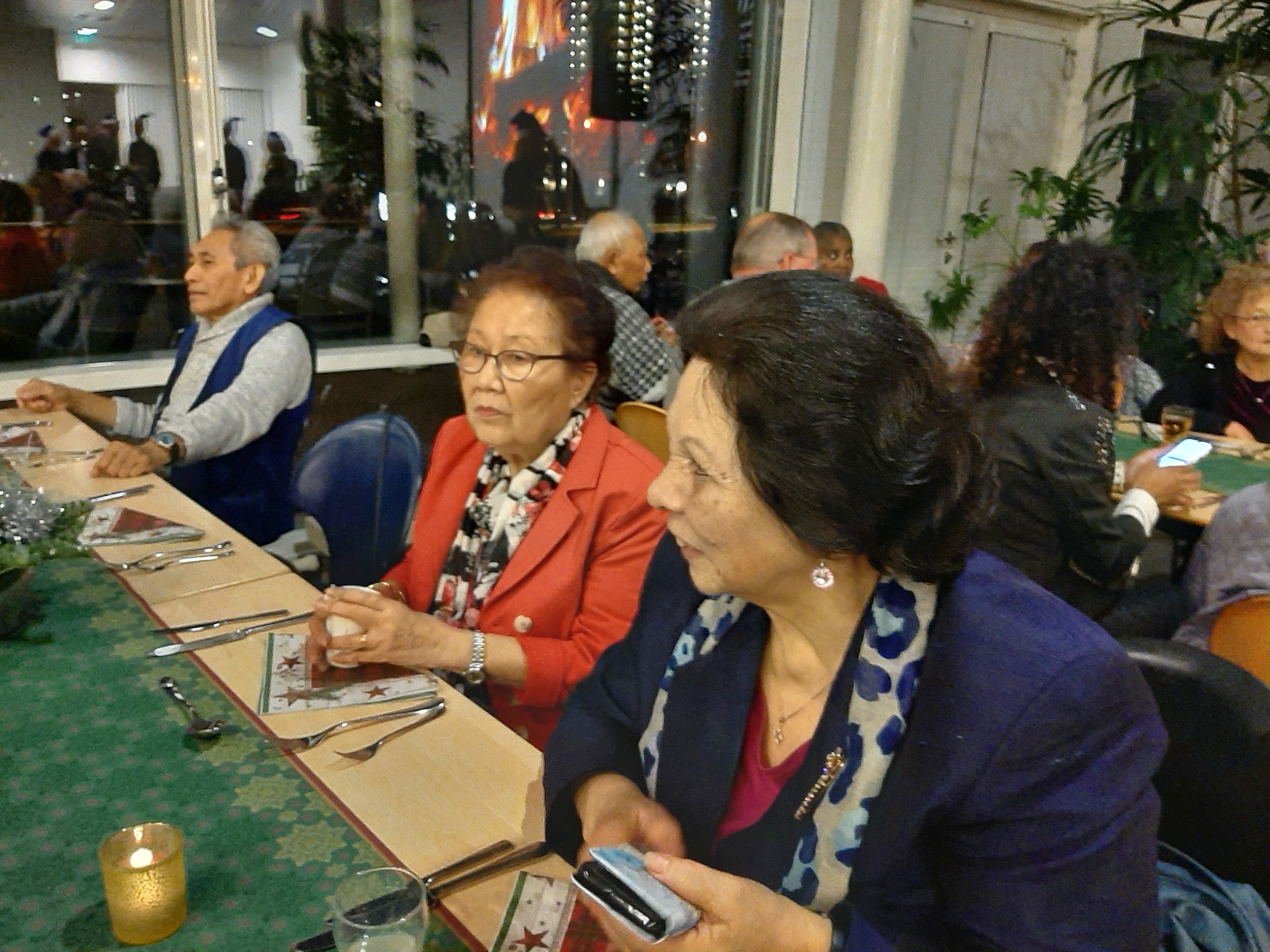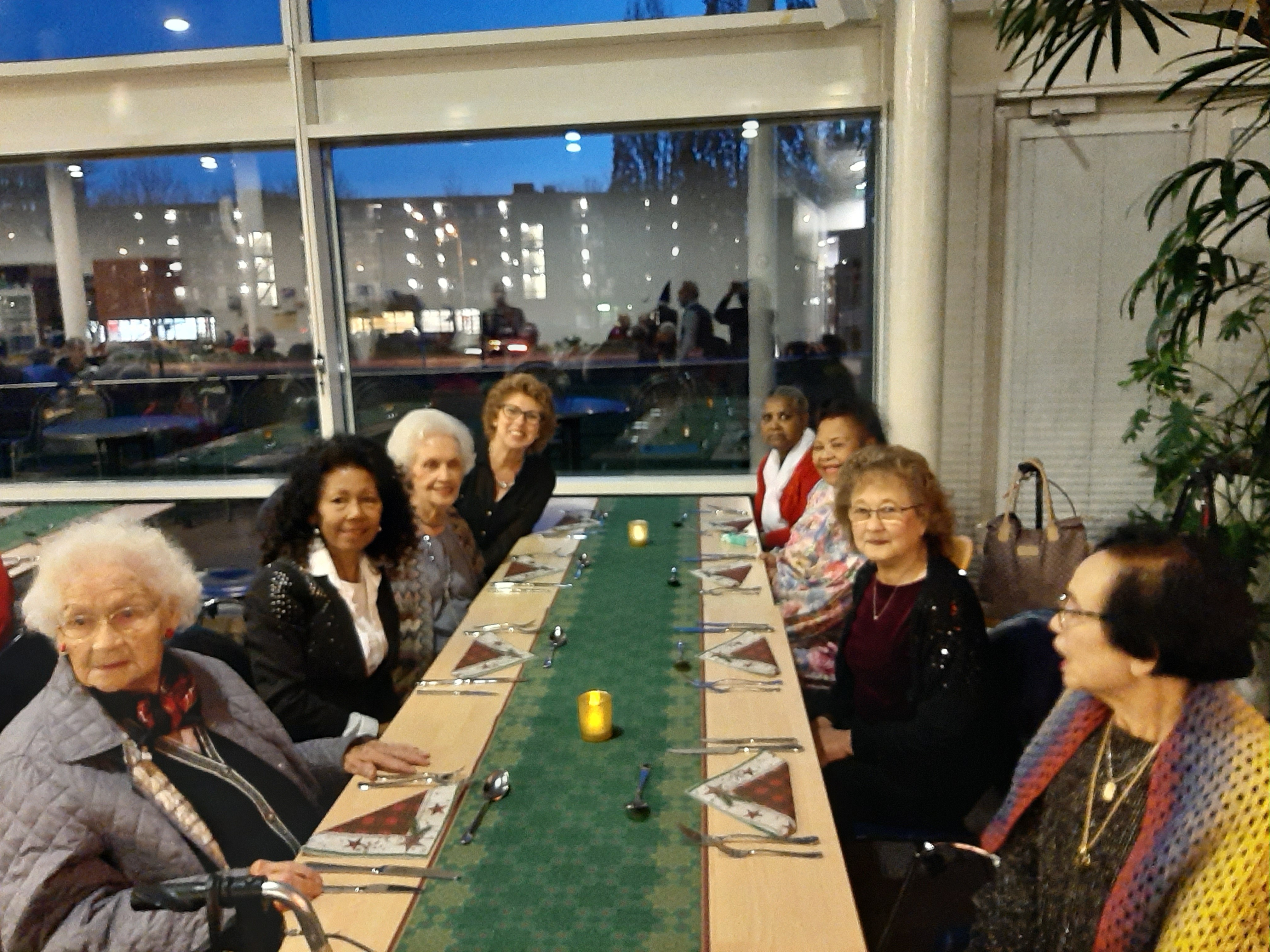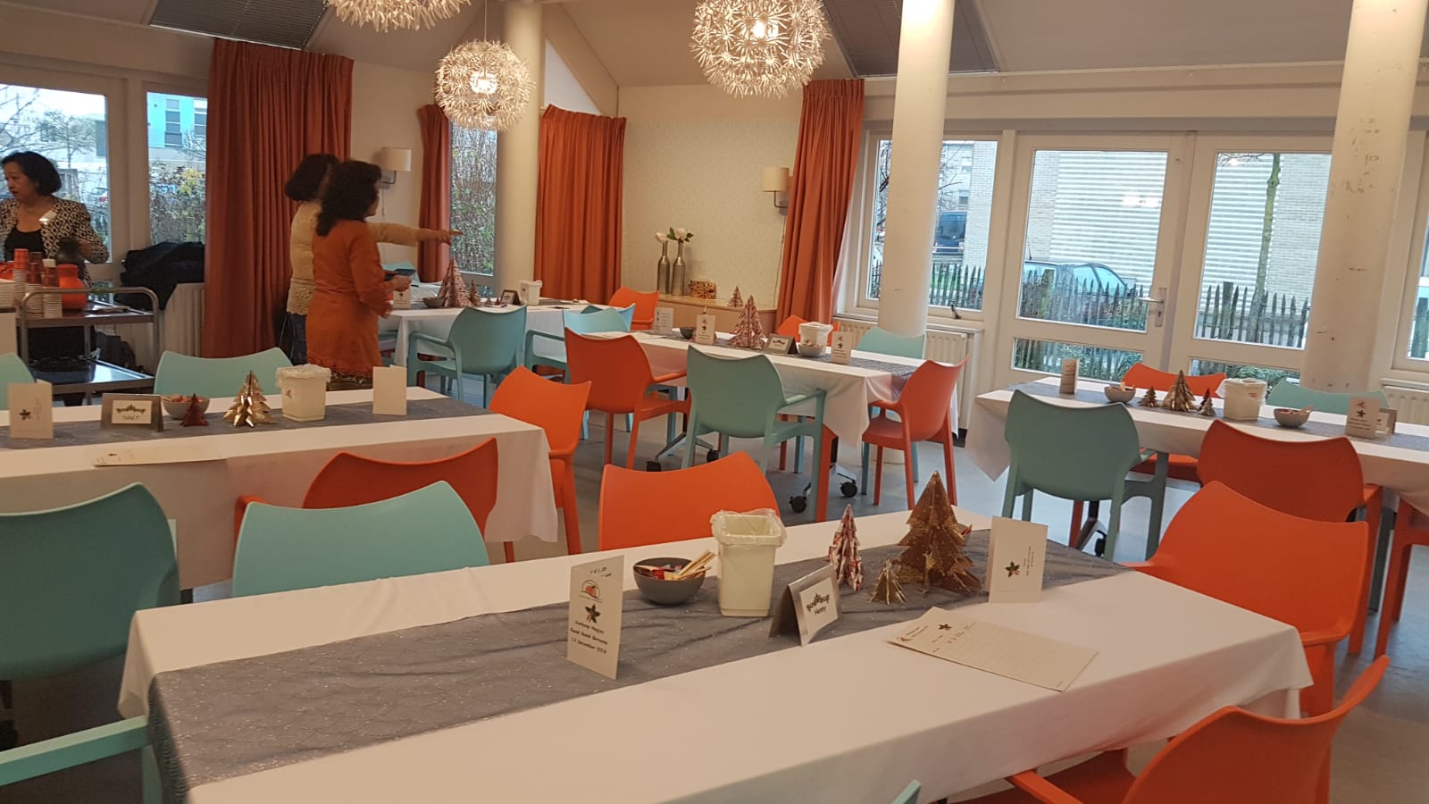De tafels waren mooi opgemaakt, alles in kerstsfeer, het zag er gezellig en sfeervol uit.